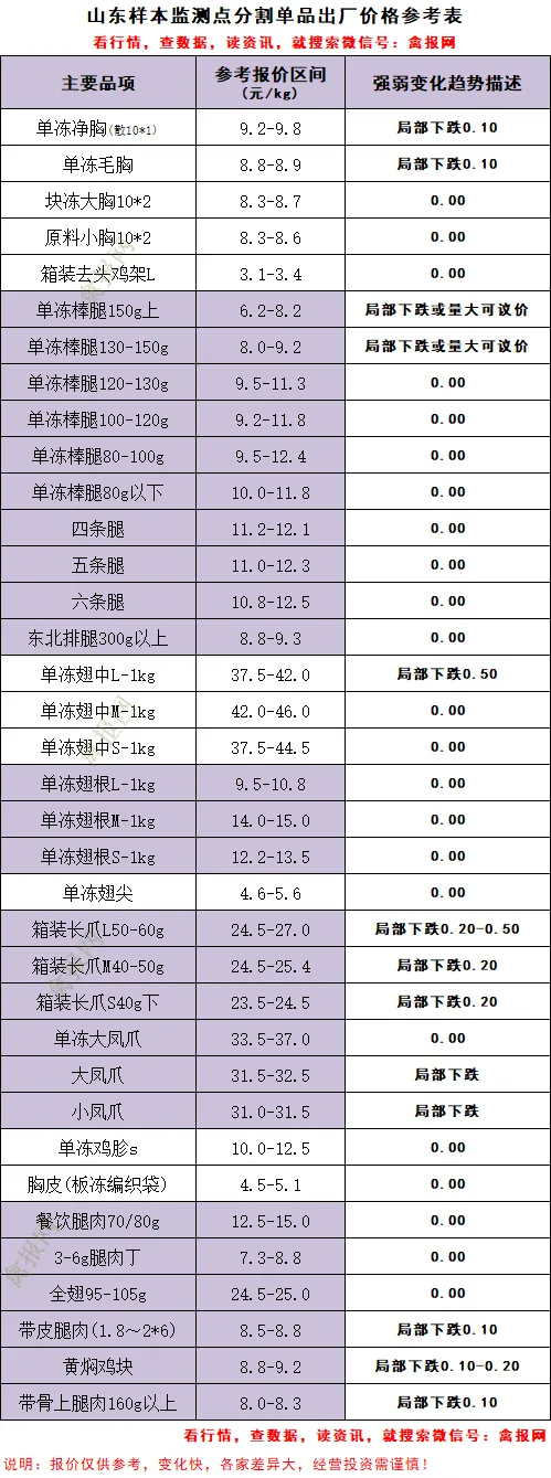 1、多姿态共存格局,主流基本面弱稳或伴随量大议价政策;部分样本点报价仍有明显下调,下调单品主要还是大棒腿、翅中L、以及爪类,幅度不一,主流200-300元/T。五一备货已经结束,只剩下局部周边市场,冷藏厂订单量减少明显,下调刺激发货。(1)山东地区:a、明日进厂社会毛鸡报价弱稳态势,局部有议价小幅走弱,主流价格3.68-3.70元/斤区间; b、产品行情转向,宰杀亏损,订单减少明显,库存增加,叠加临近月底以及五一放假,屠宰厂减停产明显;c、养户赶在冷藏放假前出栏积极;d、抽样了解看,5月出栏量比4月提升至少5%。