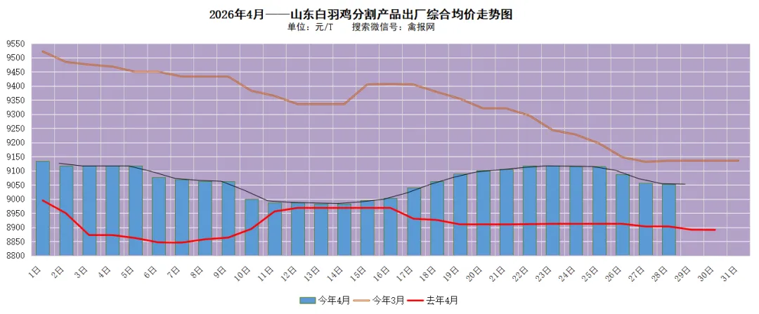 附注:以上所有观点分析,仅供参考,冻品市场变化较快,注意风险!附注:据禽报网监测数据,2025年4月的月均吨综合售价日均值为8913元/T,2026年3月吨综合售价日均值9331元/T。