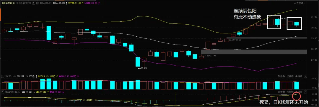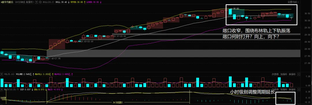从60分钟K线看(如下图,来源:choice),指数围绕60分钟布林轨上下轨振荡,小时线级别的调整时长放大。从日线看(如下图,来源:choice),K线高位反复出现阴包阳,MACD死叉,都不是什么好迹象,这里需要注意布林轨敞口打开,指数加速下跌。是比较敏感的变盘时间窗口。叠加五一长假的避险情绪和资金使用需求,两市成交额后续可能持续缩减,变盘的概率确在增加。