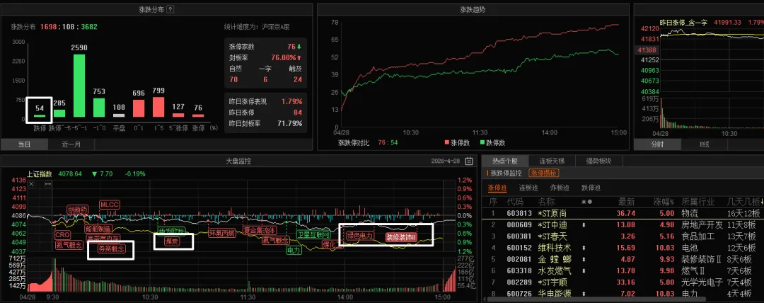 个股涨跌比接近1:2,跌多涨少(如上图)。标的走势高度分化,大涨的不少,大跌的也不少。最近业绩雷和监管雷比较多。业绩不及预期的细分行业一起跌,涨是个别业绩好的标的持续涨。脱靶率提升,赔率下降,操作难度加大。