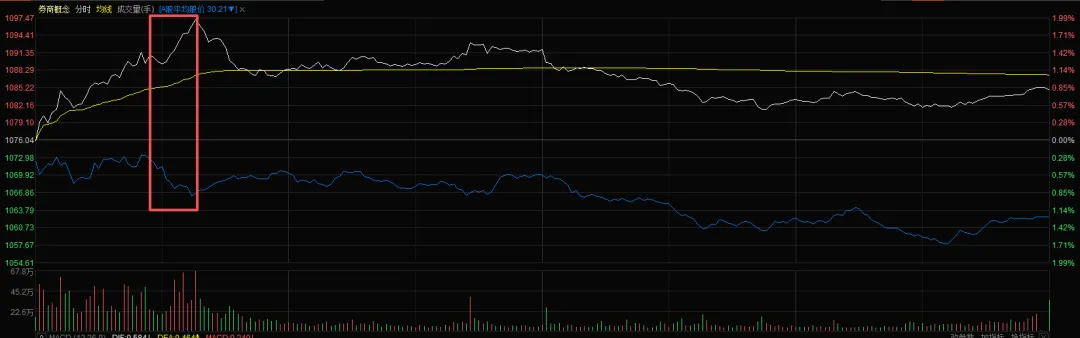另外,今天一早主力曾经尝试过拉券商,带动市场人气,延续昨日的强势盘面。但最终失败(如下图,来源choice,券商概念上,指数下),代表市场抛压较大,量化可能在扯后腿(早盘圈里做了风险提示)。所以,综上所述,在变盘敏感期,建议控制仓位,等待市场跌下来的机会。选股偏向绩优行业,如电池链、电子等板块,或者未来有困境反转预期的板块。