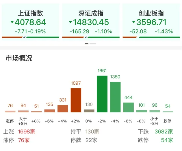 今日A股震荡盘整,沪指跌0.19%,深证成指跌1.10%,创业板指跌1.43%。沪深两市成交额约2.55万亿元,较上日有所缩量。个股跌多涨少,全市场超3600只个股下跌。行业层面,煤炭、重型机械、燃气等板块涨幅居前。航天军工、教育、发电设备等方向则有所回调。