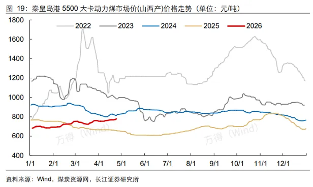 从价格端来看,煤价淡季不淡。根据长江证券,动力煤基本面方面,截至4月24日秦港动力煤市场价779元/吨,周环比上涨10元/吨。展望后市,当前终端偏低库存+国内外战略性补库需求释放+厄尔尼诺现象带来的高温预期,煤价上涨弹性有望超季节性表现。焦煤基本面方面,截至4月24日京唐港主焦煤库提价1690元/吨,周环比持平。展望后市,焦企二轮提涨落地+节前备库需求释放,短期焦煤价格偏稳运行,后续关注国内及蒙煤供应扰动、钢厂及焦企利润情况等,若动力煤涨幅扩大焦煤补涨值得期待。
