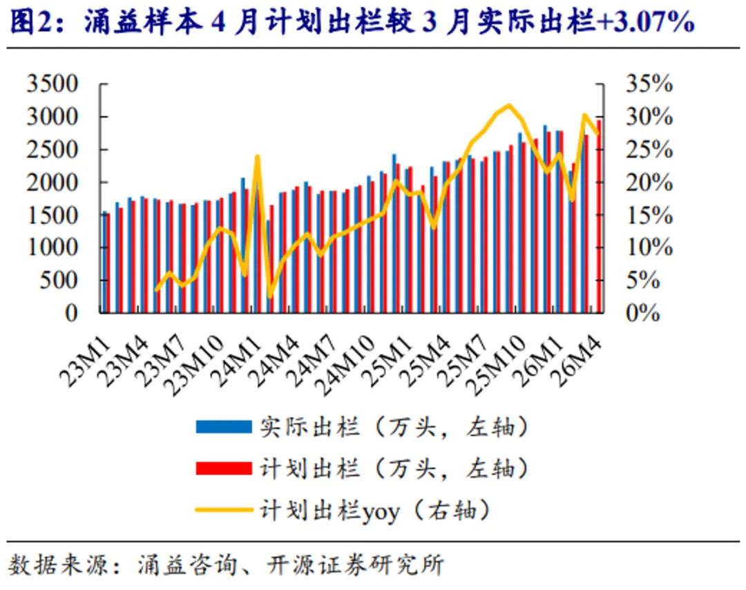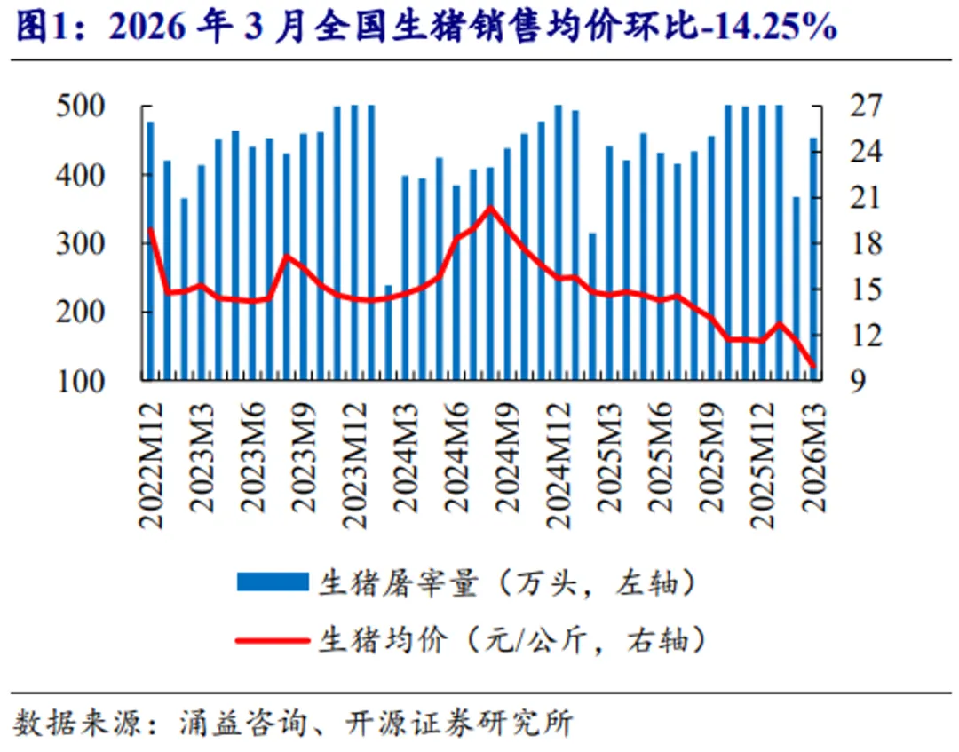 根据涌益咨询,2026年3月全国生猪销售均价9.96元/公斤,环比-14.25%,同比-31.85%。涌益监控样本2026年3月屠宰量453.84万头,环比+23.53%,同比+2.83%。涌益样本3月生猪出栏较计划完成率105.14%,4月计划出栏较3月实际出栏+3.07%。3月出栏超计划完成,主要系猪价快速下跌、行业亏损加深背景下养殖端出栏意愿提升,叠加前期递延猪源集中释放,部分养殖端倾向回笼现金并提前兑现供给压力。