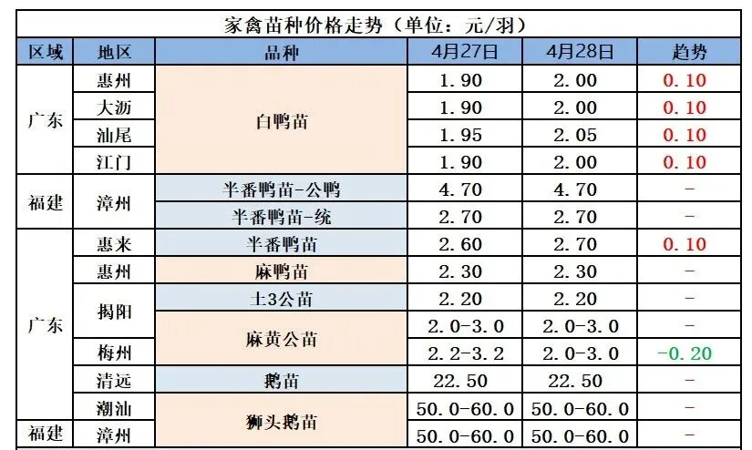 2026年4月29鸭苗价格行情:(单位:元/羽)