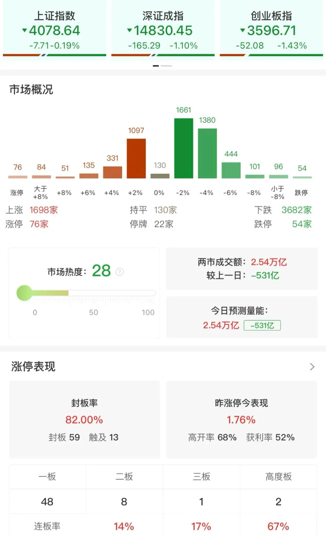 首先是赚钱效应,这是判断市场好不好最关键的指标,昨天市场赚钱效应依旧很差,接近70%的股票都在下跌,普通散户很难赚到钱