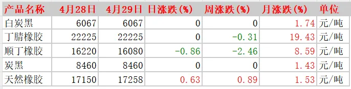 产品名称 | 4月28日 | 4月29日 | 日涨跌(%) | 周涨跌(%) | 月涨跌(%) | 单位 |