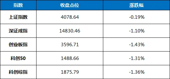 1. 指数表现:三大指数集体收跌,创业板指4连阴