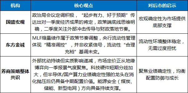 多家机构针对政治局会议定调及当前市场格局给出研判,共识指向短期震荡与中期结构性机会并存: