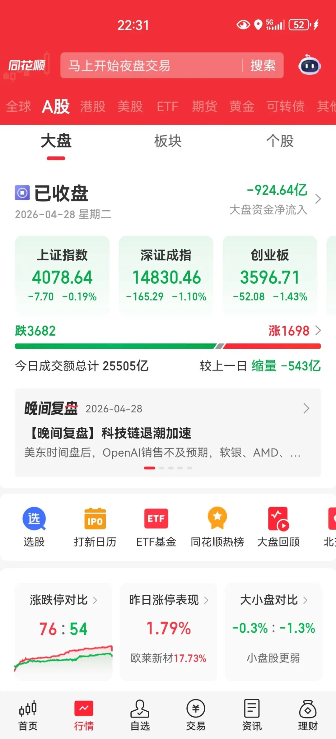 今天是2026年4月28日,周二,今天事情比较多,到现在才捞到看一看股市,今天的行情一般般,比较低迷,整体来看,低开,可以说是低开低走吧,整体是缩量下跌,涨的少跌的多,亏钱效应比较强烈,股民估计又郁闷了。