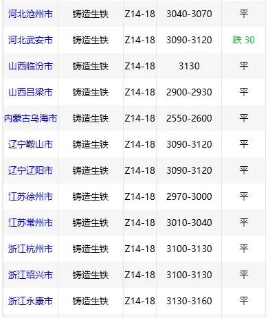 4月28日华南铸造 生铁价格稳,Z18广西3000,高州3040,阳江3040,现金含税。(单位:元/吨)4月28日华东市场炼钢 生铁报价稳,主流报价2700-2920元/吨,现款含税,一单一议。4月28日华南地区炼钢 生铁价格稳,广东地区L8-L10报2600元/吨,现款含税。4月28日华北地区炼钢 生铁报价稳,唐山2660元/吨,武安2660元/吨,临汾2830元/吨。4月28日华中市场铸造 生铁价格稳,Z18林州2980,黄石2940-2970,郴州2800,现款含税。(元/吨)4月28日东北铸造 生铁报价稳,鞍山3090-3120、辽阳3090-3120元/吨,现款含税。4月28日西南铸造 生铁价格稳,Z18报2880-3150元/吨,现款含税。4月28日西北铸造 生铁价格稳,Z18乌海2550新疆2800甘肃2800包头2700,现款含税(元/吨)。4月28日华中地区炼钢 生铁价格稳,安阳2630元/吨,大冶2560元/吨,现款含税。4月28日西北炼钢 生铁报价稳,宁夏2500包头2500甘肃2650,现款含税。(元/吨)扫码加入生铁废钢交易群想要了解更多价格行情,就上铸材行情