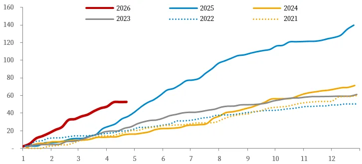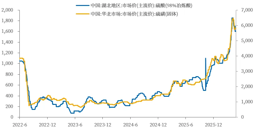 二是潜在的供应中断风险,或将给予铜价向上弹性。霍尔木兹海峡承担全球约20%的石油运输和各类大宗商品海运贸易,虽然全球铜的主要海运路线并不完全依赖于该海峡,但作为铜重要原料及副产品的硫酸供需与该海峡紧密相关。中东是全球硫磺的主产区,主要来源于石油炼化和天然气脱硫的回收过程。2025年全球硫磺产量约为8400万吨,其中中东地区产量约为2200万吨,占比约27%,同时,中东承担了全球硫磺海运贸易近50%份额。美伊冲突后,霍尔木兹海峡封闭,直接导致硫磺出口受阻,全球硫磺价格飙涨推升硫酸成本,硫酸价格跟随大幅上涨。根据隆众资讯,当前湖北地区98%硫酸价格约为1700元/吨,较年初上涨78%;根据SMM,当前出口至印度尼西亚98%的硫酸CFR价格约为345美元/吨,较年初上涨130%。