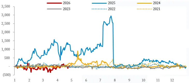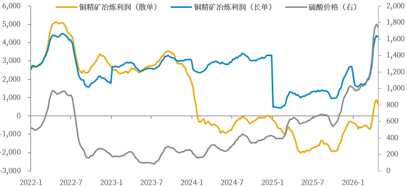首先是冶炼厂利润显著增长。硫酸作为铜火法冶炼的副产品,生产一吨精炼铜约生产3.5-4吨硫酸。在全球铜精矿供应紧张的当下,散单TC/RC已跌至-81.4美元/吨,处于历史低点,硫酸收入一定程度上补偿了加工费带来的亏损。当前从冶炼厂综合收入来看,单吨铜生产利润达到约600-800元/吨,这使得冶炼厂维持高开工,并更倾向于选择可副产硫酸的铜精矿作为原料,而减少对阳极铜的采购。因此,铜精矿的供需在此情形下表现更为紧张,从而导致矿端加工费于3月后加速下跌。