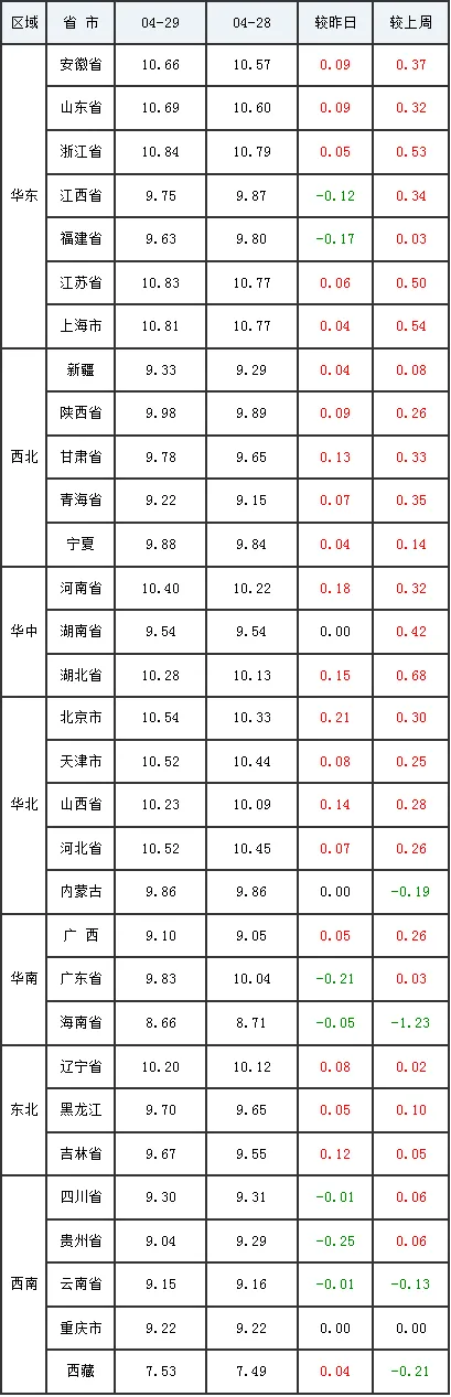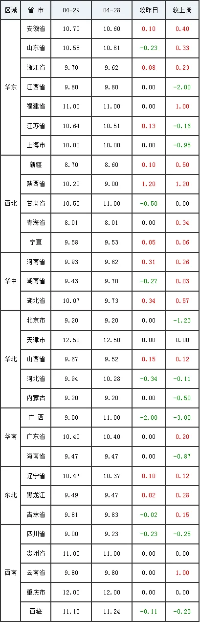 4月29日全国内三元生猪价格行情涨跌表