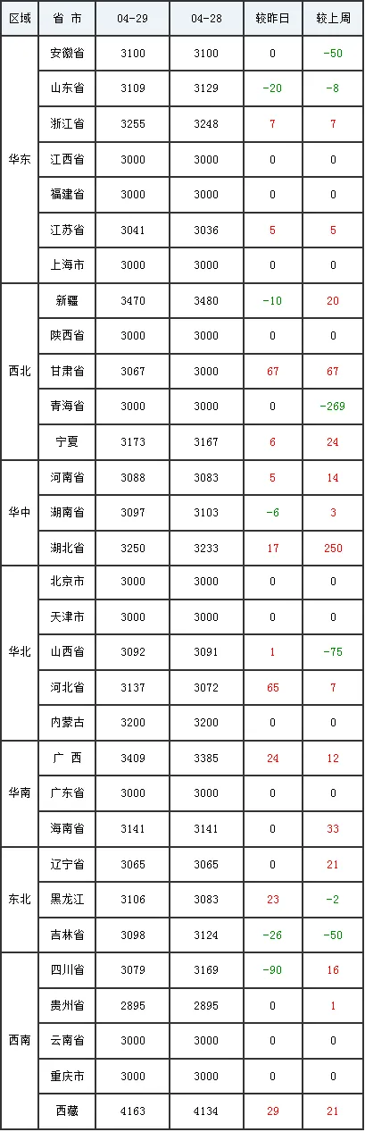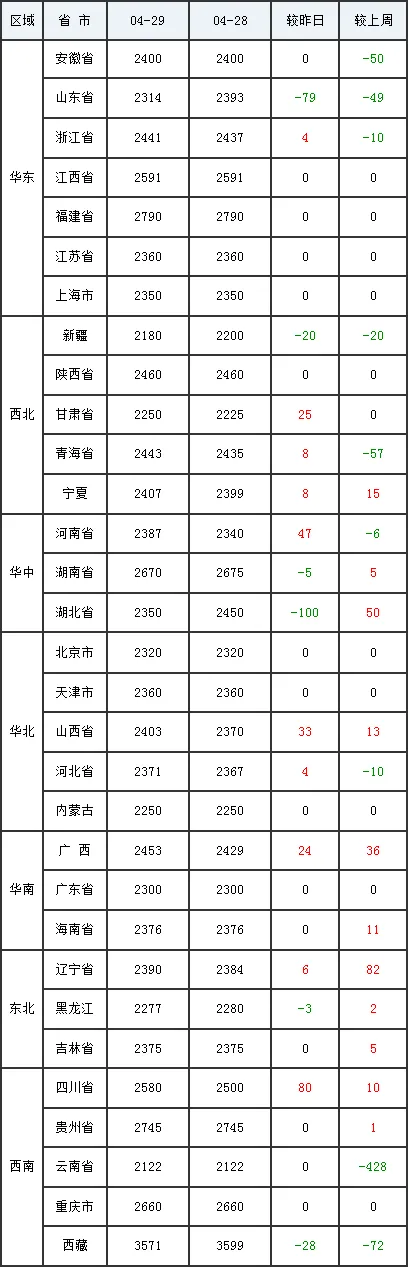4月29日全国外三元生猪价格行情涨跌表