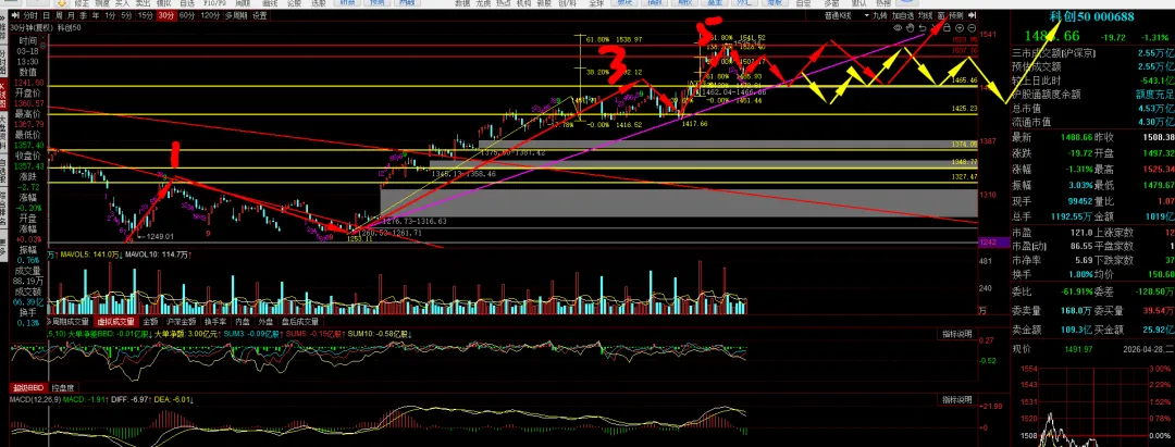 科创30分钟,5浪走完 开始调整。下方支撑1465,上方压力1526.