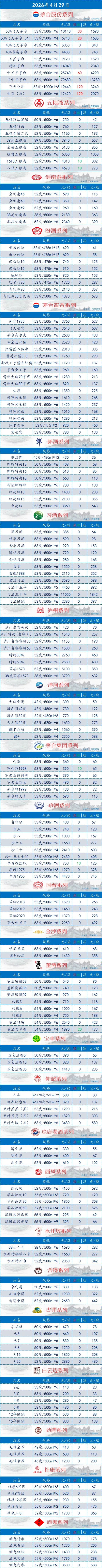 4月29日,茅台及名酒回收价格行情