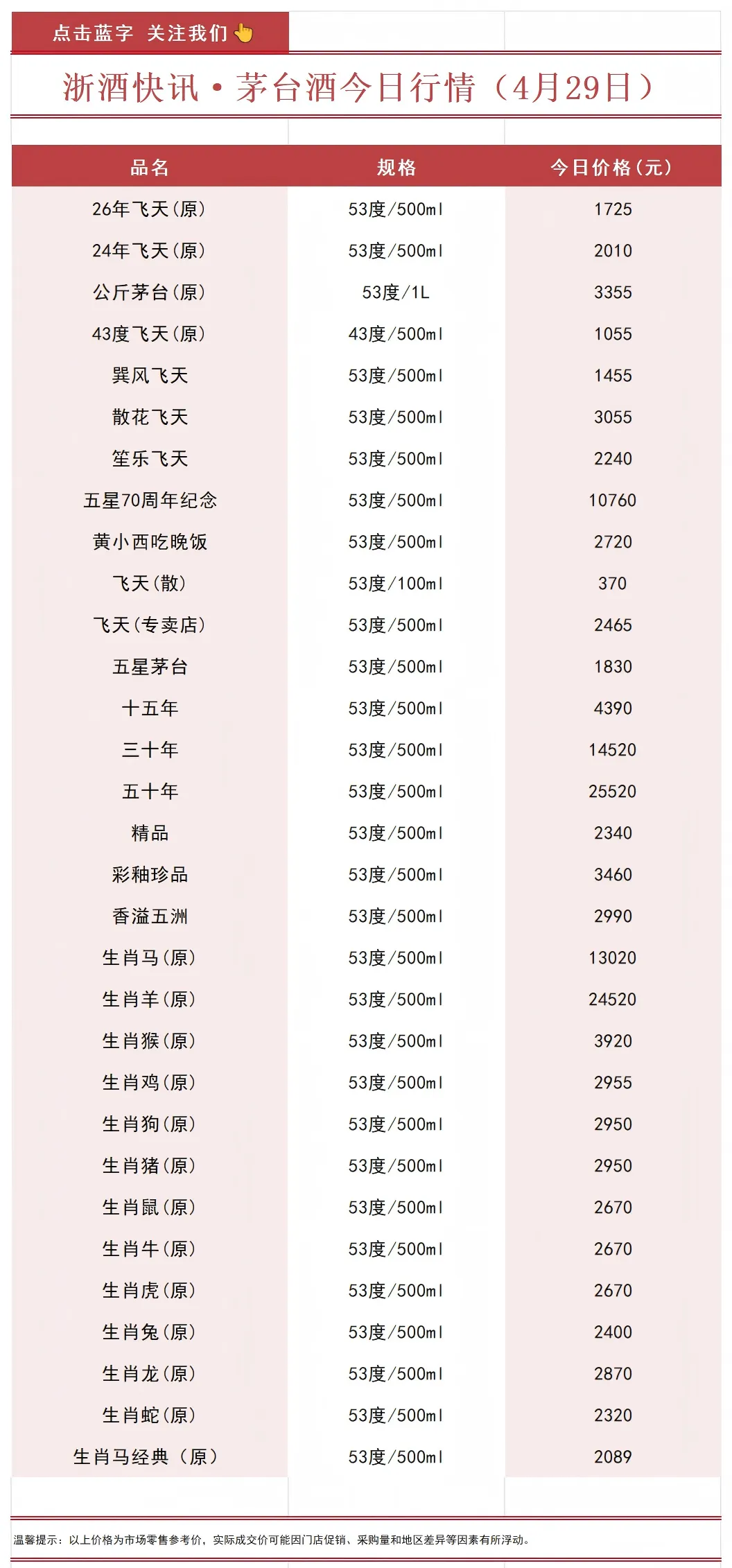 百荣酒饮-今日中国名酒价格行情指数2026.04.29