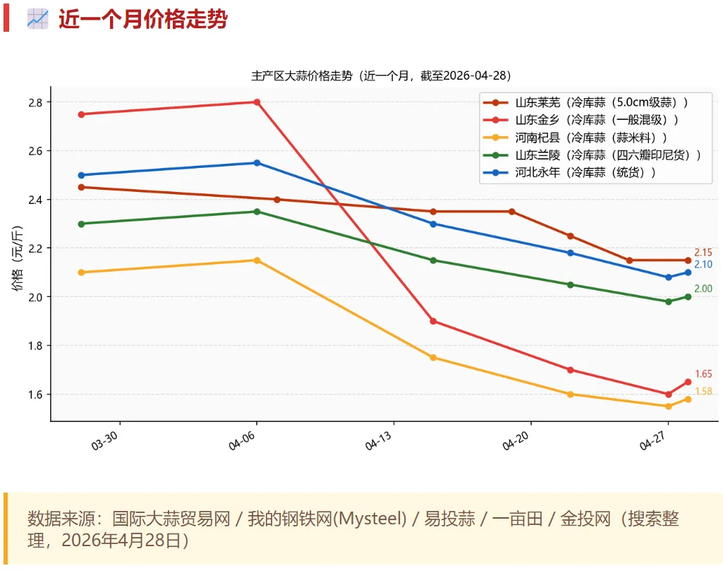 4月以来全国大蒜价格整体呈现"先涨后跌"走势。清明节前后(4月5日左右)受餐饮消费补贴政策落地及库存同比偏低支撑,金乡产地价一度冲高。但清明备货结束后需求迅速回落,加之今年秋播面积预计增加8%的预期升温,市场看空情绪加重,4月中旬起各产区价格连续阴跌。农业农村部3月底发布供需平衡表预测今年收获面积1283万亩同比增8%,这一扩种预期进一步压制了现货价格。