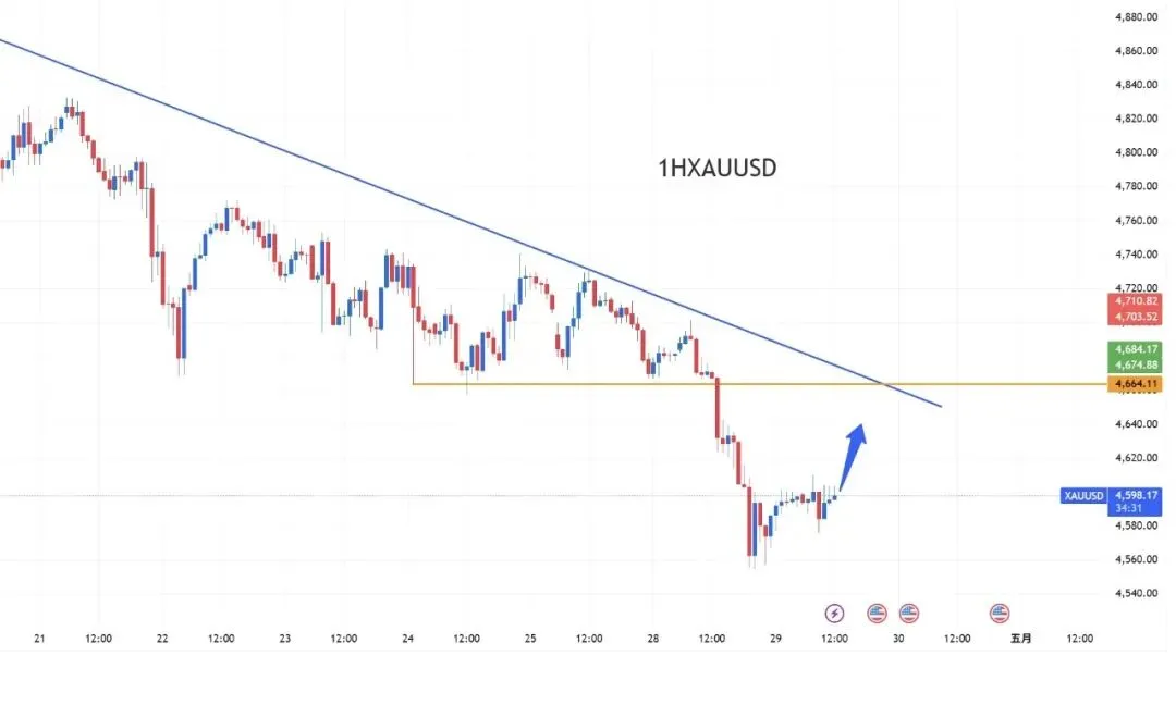 昨日黃金日線收出大陰線,形成明確下破結構,空頭趨勢已經確立。當前策略非常清晰——以反彈做空為主,順勢而為。