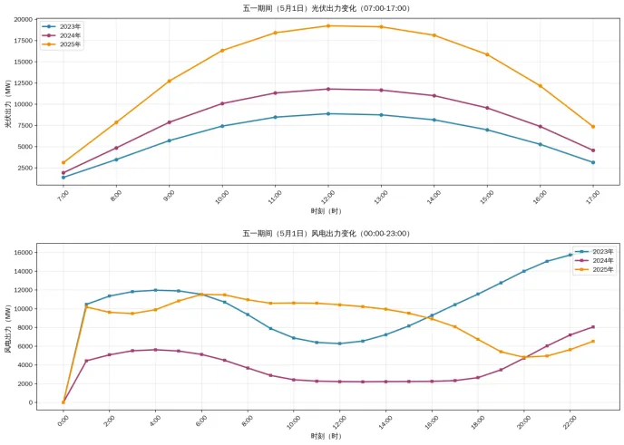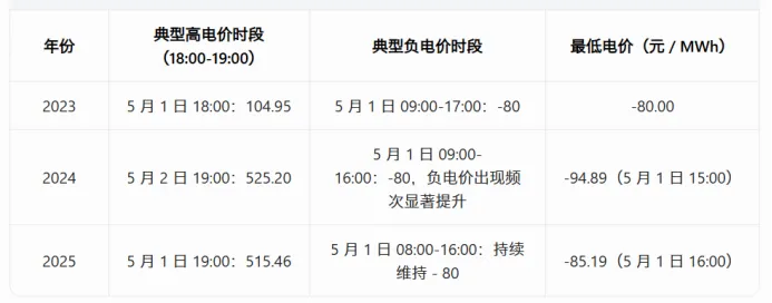 本文章通过对山东省电力市场2023年至2025年“五一”节假日期间(通常为5月1日至5月5日)的历史数据进行纵向分析,研判市场运行规律,为预测和准备2026年五一节假日的市场形势提供参考。分析核心聚焦于实际现货电价、关键边界条件(如新能源出力、负荷需求、联络线受电)及其对市场成员中长期持仓策略的潜在影响。一、节假日期间的价格表现:长时间负电价+价格波动大通过分析2023至2025年近三年的五一期间的实际现货电价数据,可以观察到以下显著趋势:负电价常态化:从2023年开始,五一期间已出现负电价。2024年负电价出现的频次和持续时间显著增加(如5月1日9时起连续多时点出现-80元/MWh),2025年负电价现象更为普遍,尤其在光伏出力高峰的中午时段,价格深度下探(如5月1日12时左右持续为-80元/MWh)。价格波动剧烈:节假日期间,由于工业负荷下降,系统调峰压力增大,电价波动性远超平日。早晚高峰(约7-8时和18-20时)受新能源出力变化和晚峰负荷叠加影响,易出现极端高价;而午间光伏大发时段,则极易触发地板价或负电价。出现极端高价的原因在于节假日期间的负荷较小,火电的机组组合开机台数较少,负荷的波动更容易造成机组的启停,机组的启停会加剧价格的波动。平均价格下降:对比2023年至2025年,五一期间的平均电价水平呈现逐年下降趋势。这主要归因于新能源(尤其是光伏)装机容量的快速增长,其在节假日期间对传统电源的替代效应愈发明显。从上表及原始数据(如2025年5月1日8-16时多个时点电价为-80元/MWh)可见,负电价已成为五一期间的常态,且覆盖时段更长。这表明,对于2026年五一期间,市场成员必须将长时间、深度的负电价作为核心风险进行管理。1.2. 市场成员中长期持仓:巨额亏损or大赚一笔的关键中长期的持仓对比例和持仓曲线对节假日的收益影响尤为显著,在差价结算的模式下结算公式可以更为明显的看出来:中长期结算电费=中长期电量×(中长期合约价格-现货价格),现货价格更低意味着,中长期结算价格更高。中长期持仓曲线对收益的影响:对于持有大量中长期合约的发电企业,其合约价格通常低于现货价格,在长时间底价的时段,发电企业即便是低负荷运行或者停机也有较高的收益。对于售电公司而言,如果此时段持有较低的中长期电量(山东对于时段的中长期比例不考核,可在后续日期增加中长期持仓),而用户当中有充电站,商场等节假日白天用电较多的用户,售电公司会有较高的利润,所以用户的用电曲线对售电公司的利润影响很大。预测偏差风险:节假日期间的实际负荷(全网/直调)通常显著低于节前预测。对比“预测”与“实际”数据,2023-2025年五一期间,实际负荷均低于预测值。例如,2024年5月1日9:00,预测全网负荷为63,475.77 MW,而实际仅为45,449.37 MW。巨大的预测偏差意味着日前电价和实时电价有较大的差距,这个电价差对于售电公司来说意味着巨大的盈利或亏损的机会,但是这种差距较难捕捉,建议售电公司保守的进行日前和实时的套利。2.1. 新能源出力:风电稳定,光伏激增,成为价格主导因素1、2023年: 五一期间光伏出力自07:00开始显著增加,午间峰值可达8,000-10,000 MW。2、2024年: 光伏出力大幅增长,午间峰值普遍超过10,000 MW,甚至达到12,000 MW以上。这是导致午间出现长时间负电价和低电价的最直接原因。3、2025年: 光伏出力继续保持高位,午间峰值多次突破16,000 MW。如此巨大的光伏出力,叠加节假日负荷下降,使得系统的净负荷(负荷减去新能源出力)曲线呈现极端的“鸭子曲线”,对调峰能力提出严峻挑战,也导致了更深的负电价。三年数据显示,五一期间风电出力水平总体稳定,但在日内有一定波动。例如,2023年5月1日凌晨风电出力在10,000 MW左右,2024年同期降至4,000-5,000 MW。风电的波动性增加了市场的不确定性。图4 近三年5月1日午间12:00左右新能源及电价数据表结论清晰:尽管2025年负荷较前两年有所上升,但光伏装机的爆发式增长(午间出力较2023年增长一倍以上)完全抵消了负荷增长,导致系统供大于求的局面更加严重,从而锁定了午间的负电价。2026年五一期间,光伏出力预计将进一步增长,午间负电价风险有增无减。节日负荷特性: 五一期间,由于工业负荷大量减少,负荷曲线呈现出典型的“早、晚双峰,午间谷底”的节假日特征。系统总负荷相对工作日显著降低。峰谷差变化: 随着光伏装机增加,午间净负荷(负荷-光伏)急剧下降,进一步拉大了与晚峰负荷的差距。这对火电等可控机组的深度调峰能力以及抽水蓄能、新型储能的调节能力提出了更高要求,和前文提到的节假日负荷较小,电网火电开机组合也有较大关系。晚峰价格支撑: 尽管午间价格极低,但每天18:00-21:00的晚高峰时段,由于光伏出力归零、风电出力波动、负荷攀升,电力供需重新趋于紧张,电价迅速回升,甚至出现500元/MWh以上的高价(如2024年5月2-3日)。这表明,精准预测晚峰负荷和新能源出力,是市场成员制定现货交易策略的关键。图5山东五一联络线受电负荷影响分析(2023-2025年数据对比)从数据看,“联络线受电负荷”在2023-2025年五一期间相对平稳,其变化对市场价格的影响主要体现在边际上,并非价格剧烈波动的主导因素。例如,2023-2025年5月1日,联络线受电负荷多维持在9,000-14,000 MW之间。其主要作用在于增加了省内消纳压力,特别是在新能源大发时段,进一步恶化了供过于求的局面