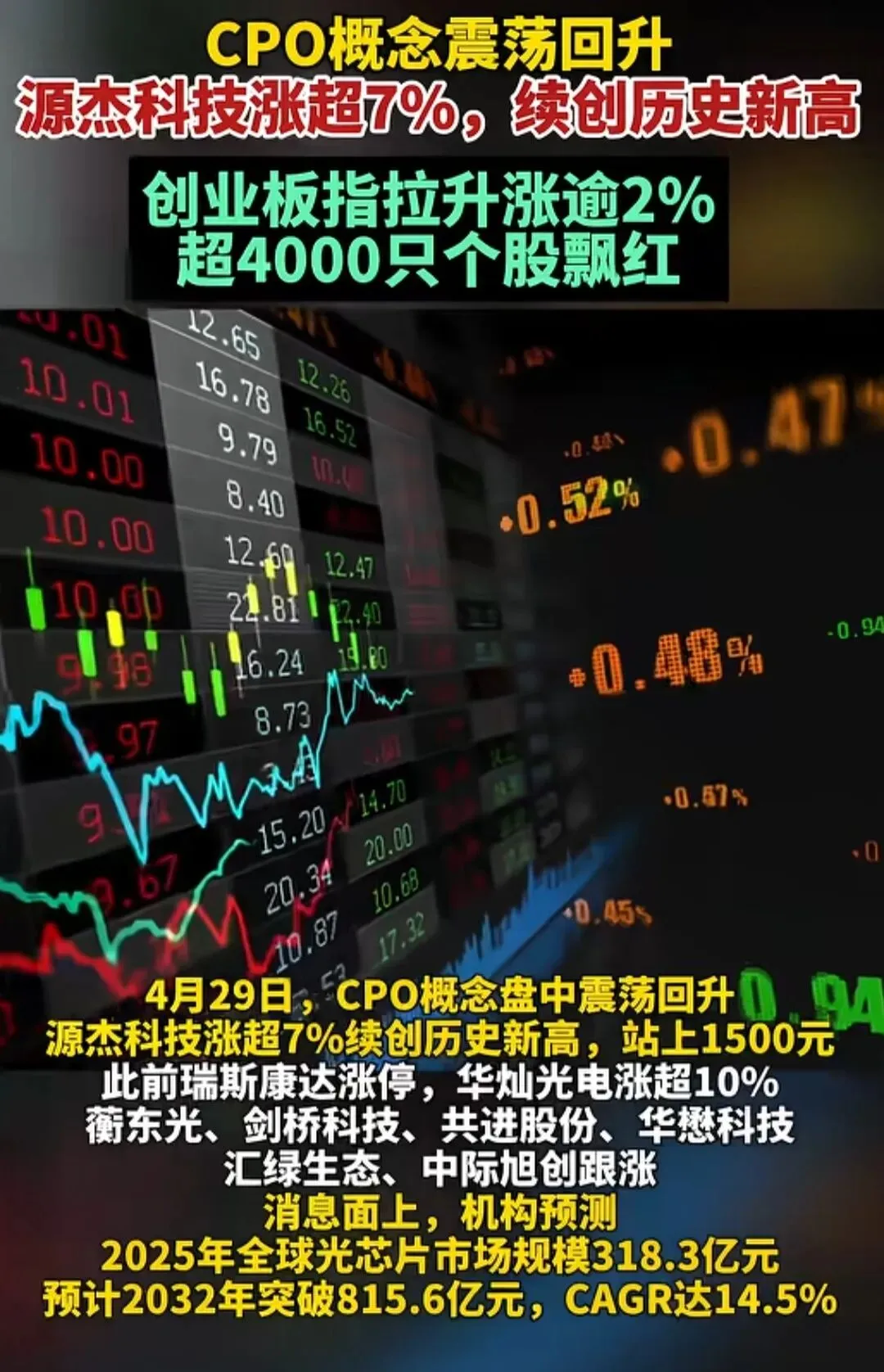 ✅ CPO概念全线炸裂:源杰科技涨超7%,直接站上1500元大关,再刷历史新高!瑞斯康达涨停、华灿光电涨超10%,衡东光、剑桥科技、共进股份、华懋科技等集体跟涨,整个光模块产业链都在狂飙!
