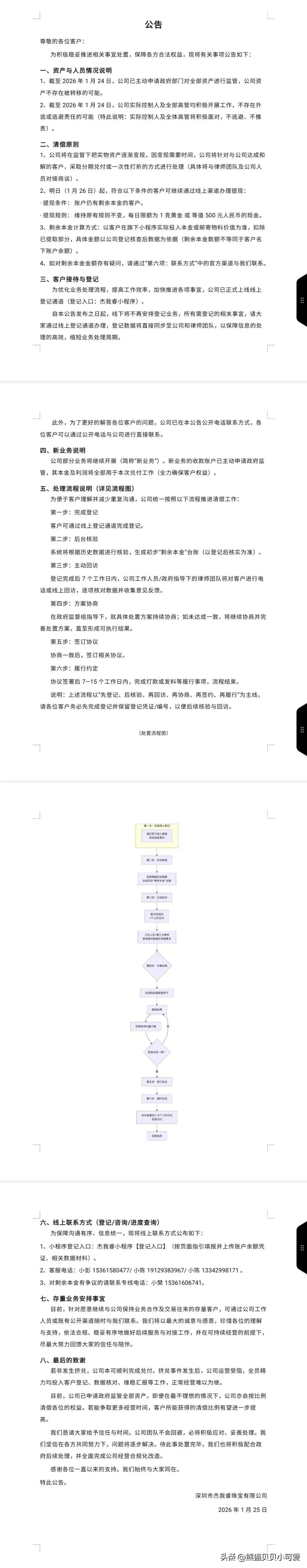 面对舆情,1月25日,深圳市杰我睿珠宝有限公司发布公告称,截至2026年1月24日,公司已主动申请政府部门对全部资产进行监管,公司资产不存在被转移的可能。截至2026年1月24日,公司实际控制人及全部高管均积极开展工作,不存在外逃或逃避责任的可能。