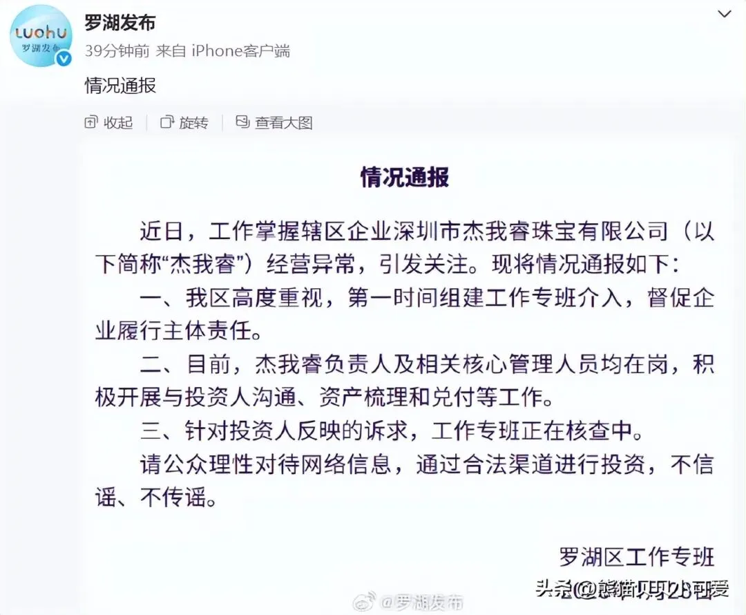 这一次,国家和监管介入的效率很高,1月28日,深圳罗湖区工作专班公告称,近日,工作掌握辖区企业深圳市杰我睿珠宝有限公司(以下简称“杰我睿”)经营异常,引发关注。现将情况通报如下: