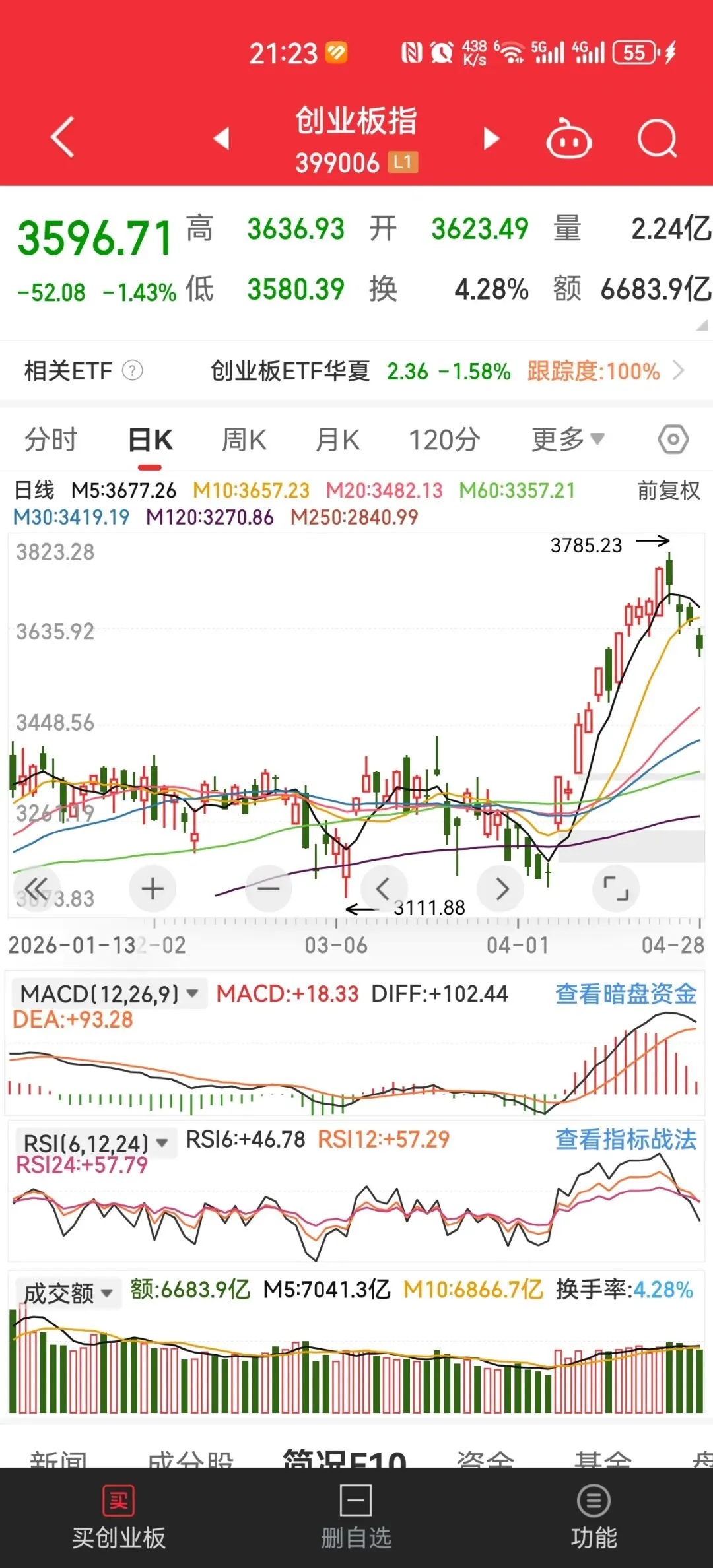 创业板是这波上涨的龙头,今天跌破十日均线,预示着接下来将走震荡行情,也就是区间震荡的高抛低吸。