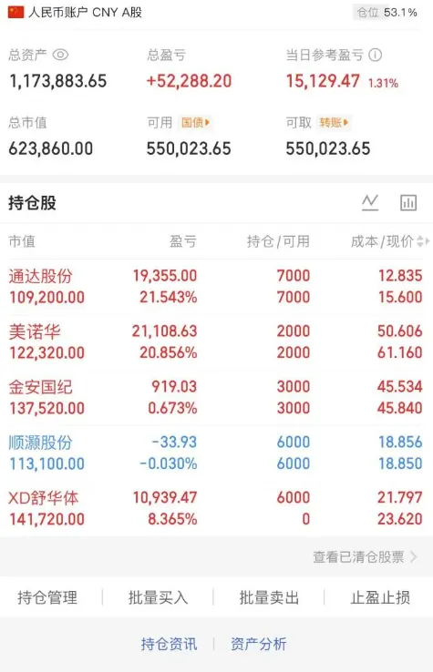 今天的操作:金安国纪昨天午后炸板抛压,震荡回升收在 5 个点左右,今天冲高回落延续震荡,浮盈 0.67%,重点关注午后能否拉升,若不能走强就果断离场,不恋战。顺灏股份今天低开后震荡回升,目前小幅浮亏,先观望一下,看午后能否转强。美诺华、通达股份两只标的趋势一直走得很稳,继续格局持有,目前分别浮盈 20.86%、21.54%,稳稳吃完这段上升行情。舒华体育今天业绩分红,顺势接回,再次强势上板,浮盈 8.37%,这就是反复跟踪强势票的好处。