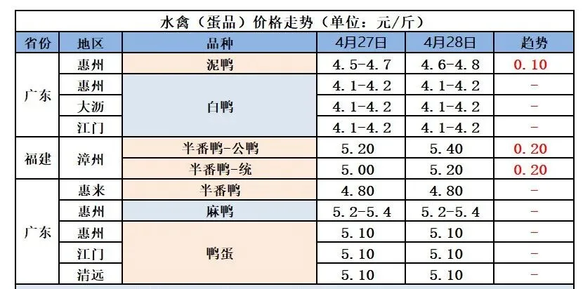 4月28日南方桂柳广东区域毛鸭报价(元/斤) |