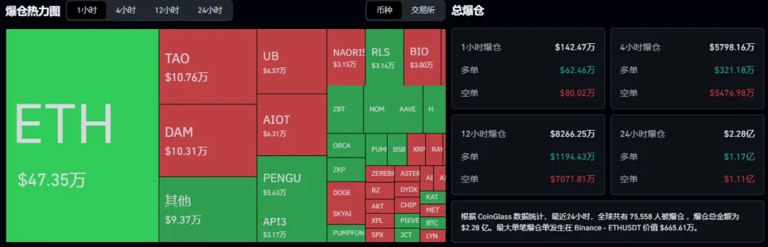 过去24小时全网共有75,558人被被爆仓,爆仓总金额为$2.28亿美元,多单爆仓1.17亿美元,空单爆仓1.11亿美元。📊 主流币表现: