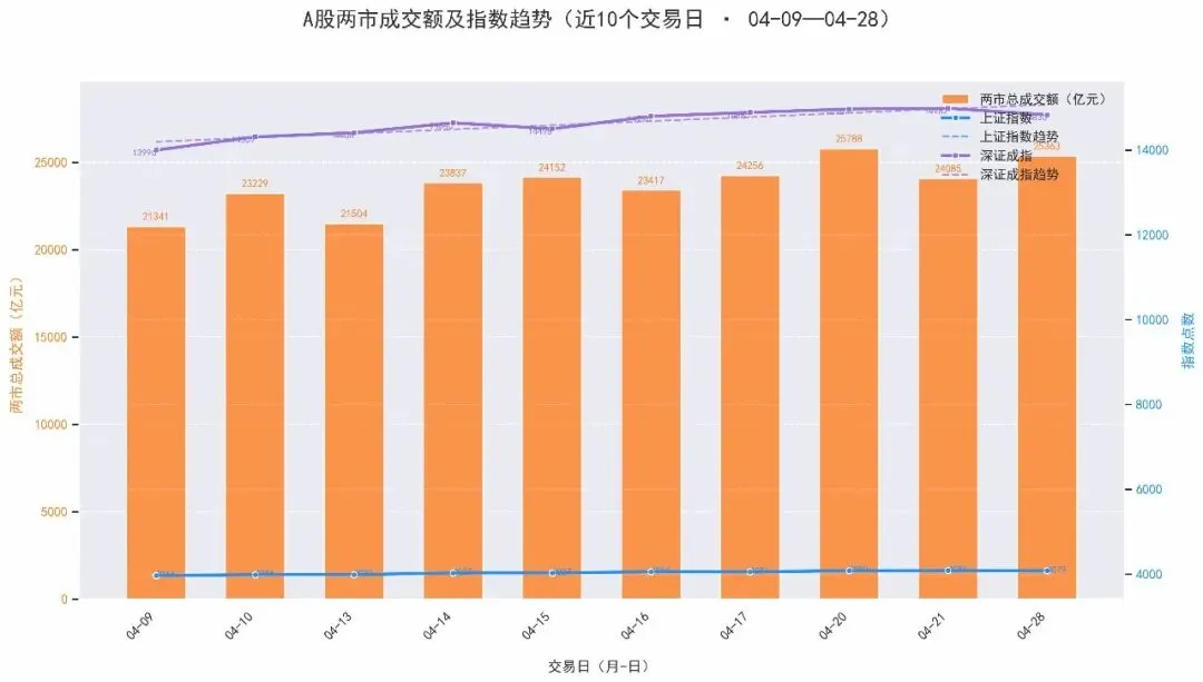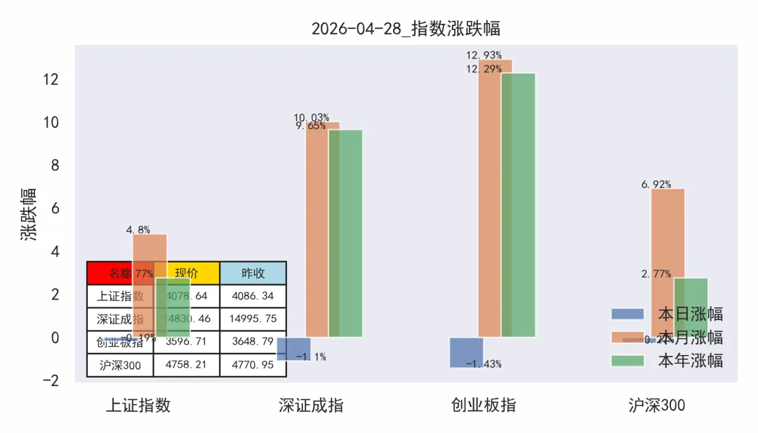4 月 28 日 A 股沪强深弱、极致分化,权重护盘、成长重挫,节前避险情绪浓厚。上证指数收4078.64 点(-0.19%),深成指跌1.10%,创业板指大跌1.43%,科创 50 跌1.36%。两市成交2.54 万亿元,较昨日缩量 531 亿元,观望氛围升温。个股涨跌比1698:3682,超七成下跌,赚钱效应低迷。板块严重分化:煤炭、燃气、电力、医药、券商等防御与中特估逆势走强;半导体、AI 算力、光伏、能源金属等成长赛道集体重挫,资金从高位题材撤离、抱团低估值权重。指数稳而个股弱,市场进入节前防御、高低切换阶段。