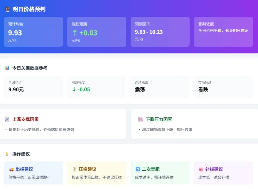🔗 产销价差分析:猪肉(16.50) - 生猪(9.90) = 6.59元(价差率66.5%)。价差率较高,屠宰利润丰厚,但终端消费承压,需警惕价格回调风险。