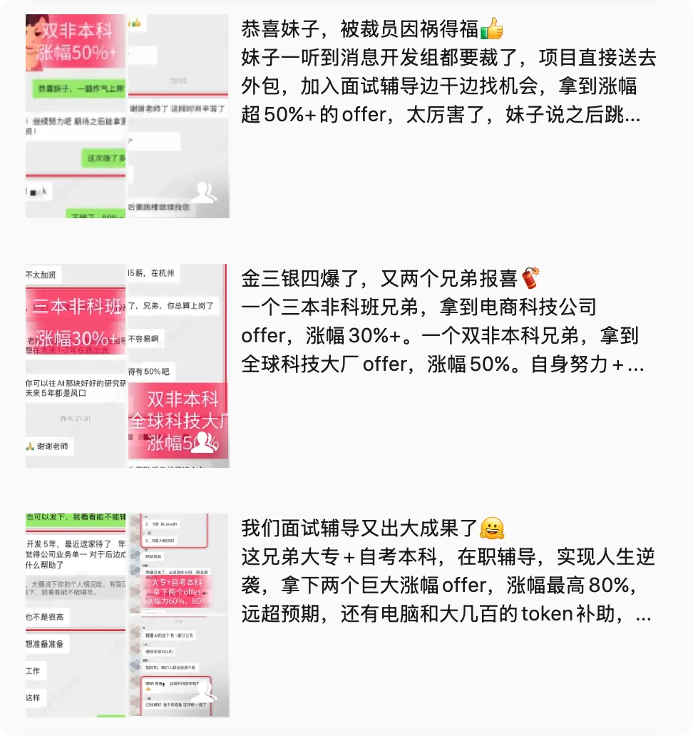 我们面试辅导帮助了许多兄弟姐妹上岸,连外包/非科班挺进自研、国企、中大厂的都有,如果你也在瓶颈期,赶紧冲一把吧。