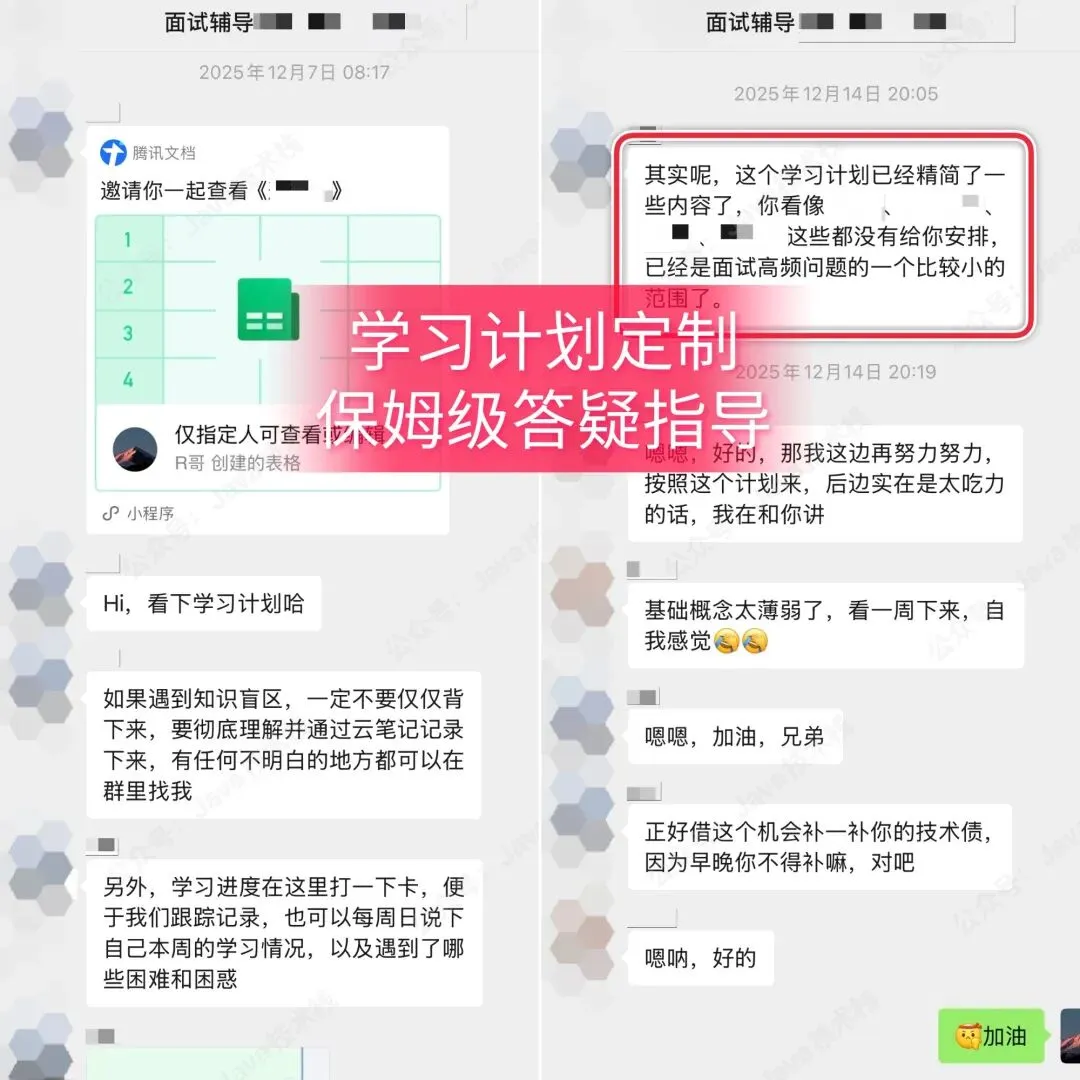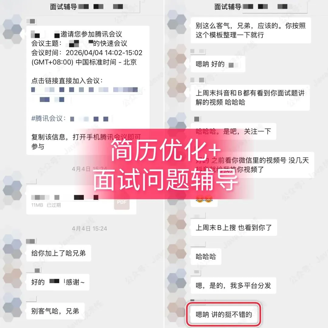 面试辅导含永久Java面试库 + 大厂场景题 + AI 实战 + 模拟面试 + 定制学习计划 + 技术指导 + 简历优化 + 面试复盘 + 求职指导等一条龙服务,全程大厂 P8 导师 1 v 1 辅导陪跑,已帮助许多小伙伴成功上岸。