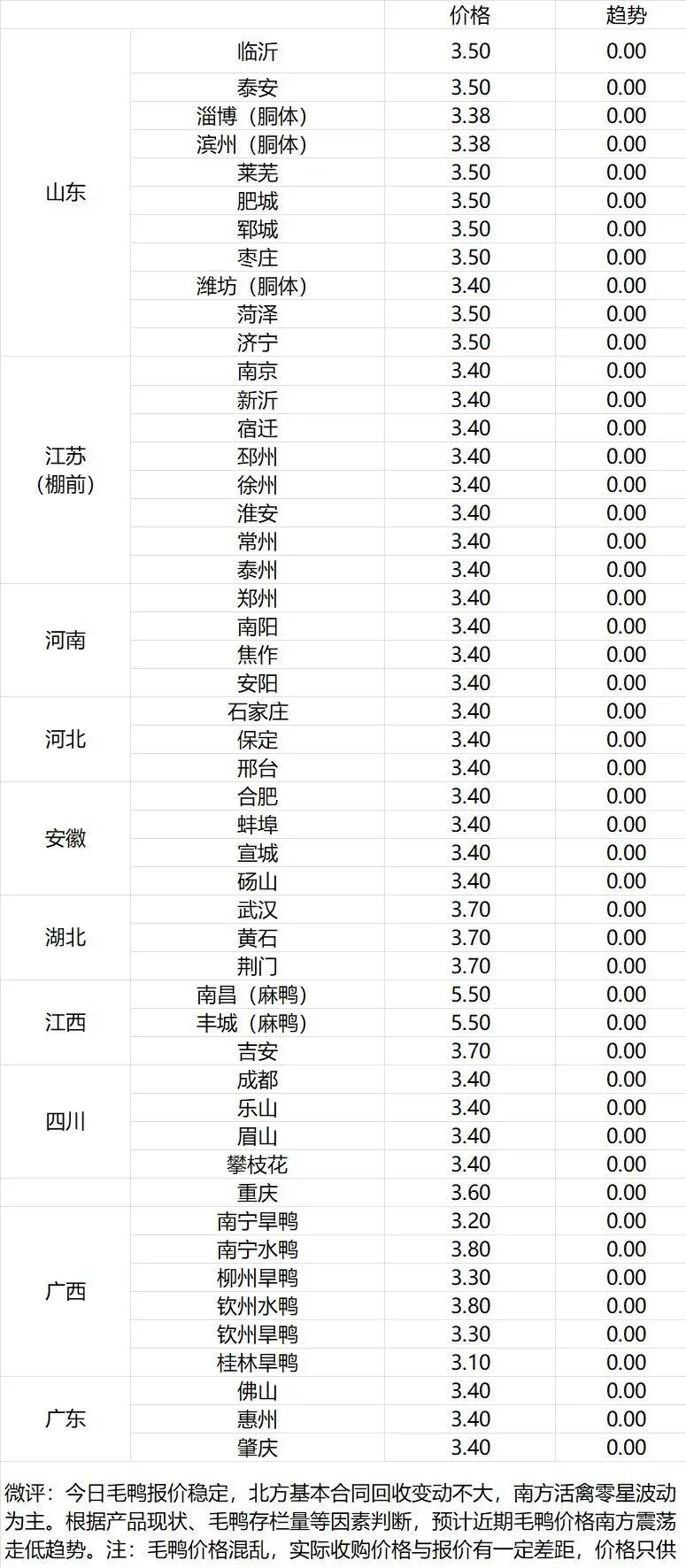 微评:鸭苗报价稳定。(注:南方只报当天价格)大厂控量保价,排苗计划偏紧,窄幅波动为主。根据产品、养殖成本及鸭苗现状分析,预计近期鸭苗价格呈震荡微调趋势。种蛋报价稳定。温馨提示:该价格为主流厂家报价,实际销售价格以成交价格为准,价格仅供参考。