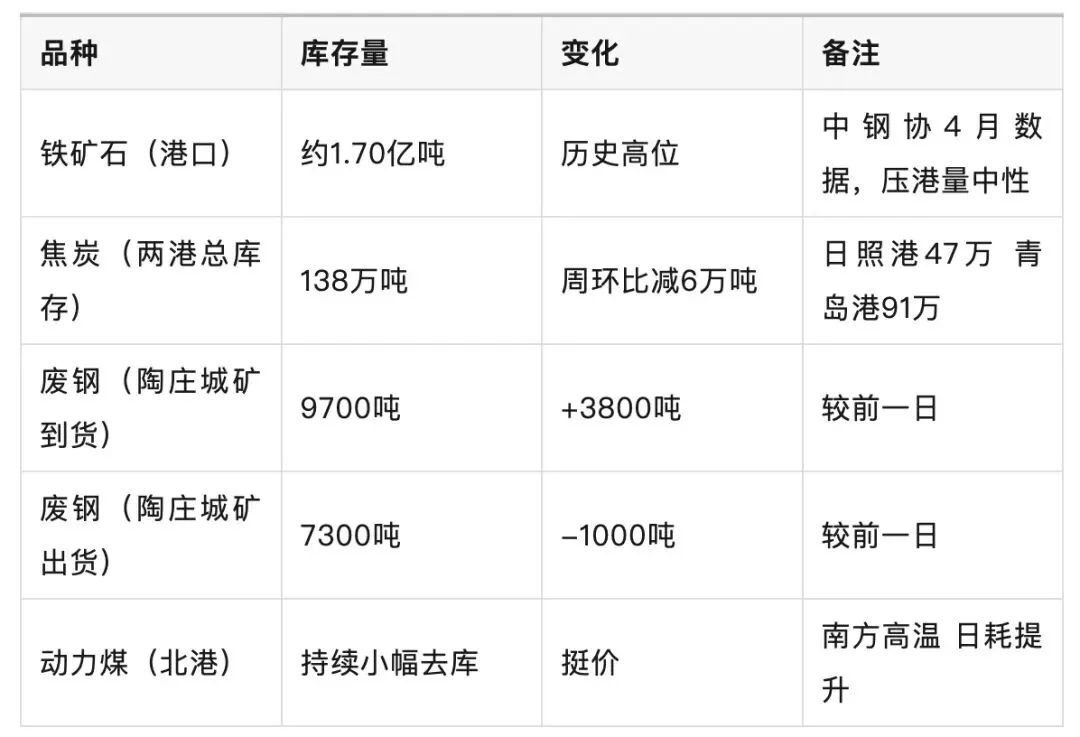 短期(1-2周): 五一节前补库进入尾声,预计原料价格维持高位震荡。铁矿石受普氏指数及海运费支撑,回调空间有限;焦炭因成本及库存去化保持平稳;废钢或延续偏弱,电炉利润受限。关注中东局势是否进一步升级。