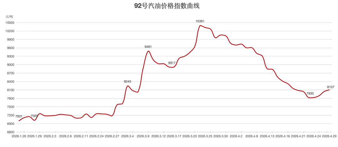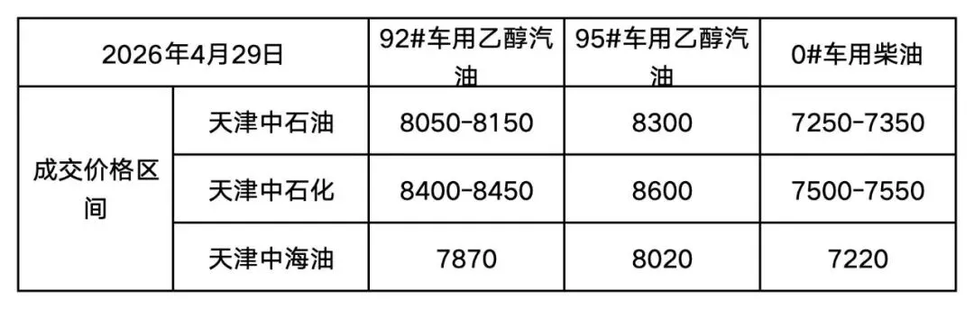 今日天津成品油市场主营单位汽柴油价格延续与地炼价格同频上涨的态势,其中主流汽油价格上调幅度为50-60元/吨,柴油价格上调幅度为20-60元/吨。最新辖区汽柴油主流成交价格区间分别为:92#汽油7870-8050元/吨、0#柴油7200-7250元/吨。临近五一假期,市场备货需求上升,购销积极性提高,短期汽柴油呈现量价齐升的良好局面。