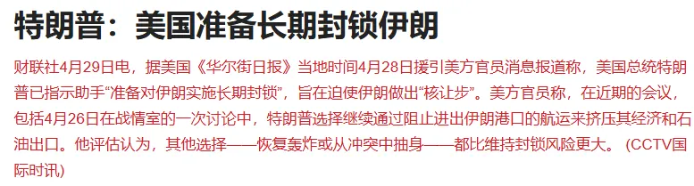 美国总统特朗普已指示助手“准备对伊朗实施长期封锁”,旨在迫使伊朗做出“核让步”。美方官员称,在近期的会议,包括4月26日在战情室的一次讨论中,特朗普选择继续通过阻止进出伊朗港口的航运来挤压其经济和石油出口。他评估认为,其他选择——恢复轰炸或从冲突中抽身——都比维持封锁风险更大。