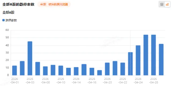 昨天今天近4000家下跌,今天近4000家上涨,119家涨停。值得一提的是,4月份下旬以来,市场跌停家数明显增多,4月24日以来,跌停家数都在40家以上。