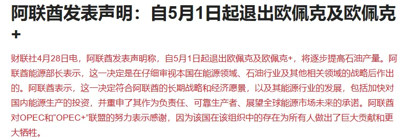 阿联酋发表声明称,自5月1日起退出欧佩克及欧佩克+,将逐步提高石油产量。阿联酋能源部长表示,这一决定是在仔细审视本国在能源领域、石油行业及其他相关领域的战略后作出的。