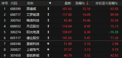 除了锂电材料外,储能、逆变器板块也是暴涨,鹏辉能源涨停,固德威暴涨超15%,艾罗能源涨超14%,锦浪科技涨超10%,阳光电源涨超6%。