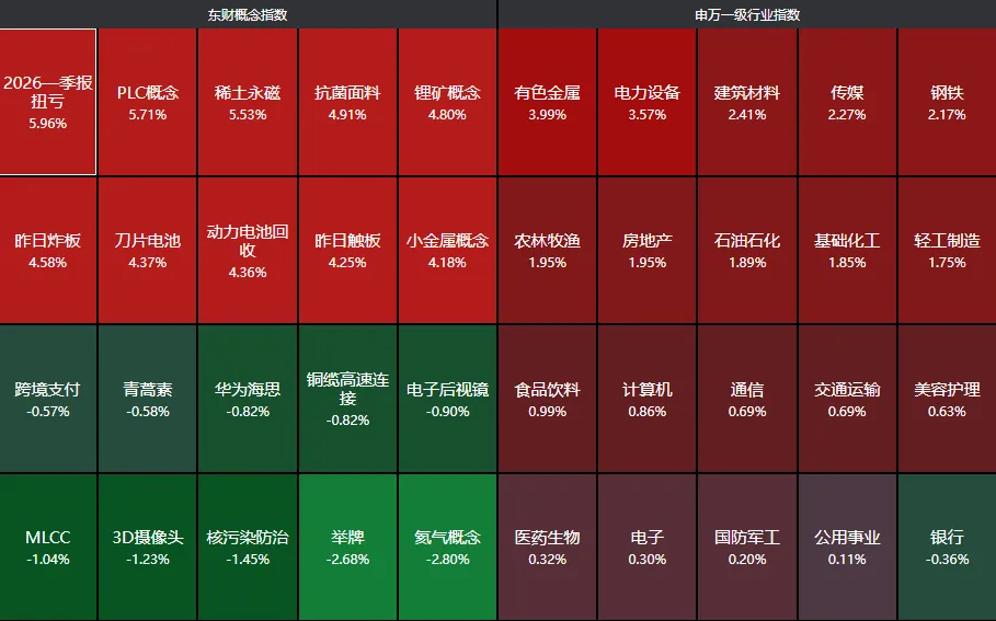 分行业来看,有色金属、电力设备、建筑材料等领涨,银行板块下跌。