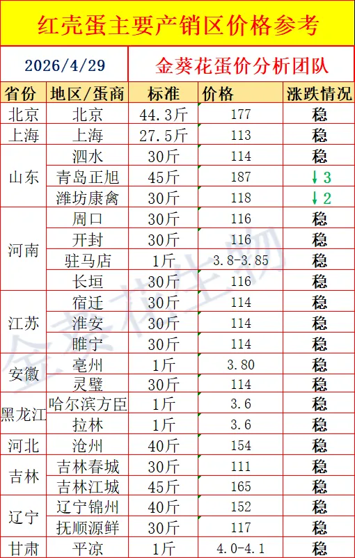 2 0 2 6年 4月 29日全国鸡蛋主流价格