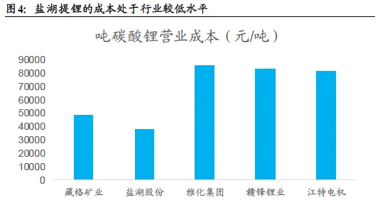 盐湖提锂省去了矿石的开采、破碎和选矿环节,且在分离端一般采用吸附、萃取等方式,成本相对焙烧等低,因此盐湖提锂的成本处在行业成本曲线的最低位置。国内来看,根据盐湖股份、藏格矿业年报数据测算,2024年其碳酸锂吨营业成本分别为3.8、4.8万元/吨,而以锂辉石为原料的雅化集团、赣锋锂业碳酸锂产品吨营业成本分别为8.5、8.3 万元/吨,以锂云母为原材料的江特电机吨营业成本为8.1万元/吨。