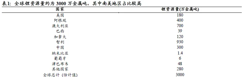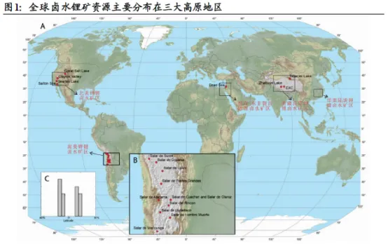 全球卤水锂矿资源的分布较为集中,主要分布于三大高原:南美安第斯山脉中部高原、中国青藏高原和美国西部高原。盐湖的形成主要是由于淡水湖泊的蒸发量长期少于注入量,使得湖泊矿物浓度稳步上升。根据《盐湖成矿系统演化及其对资源分布的控制机制分析》介绍,由于地质构造运动的持续,“盐湖深部热液活动频繁,带来丰富的稀有金属元素,它们与湖水中的常量元素相互作用,形成硼酸盐、锂盐等特色矿物”。因此盐湖锂资源主要分布在干旱的高原地区,高蒸发地区是盐湖形成的前提条件之一,而高原地区一般地质运动较多,锂资源的富集相对容易。