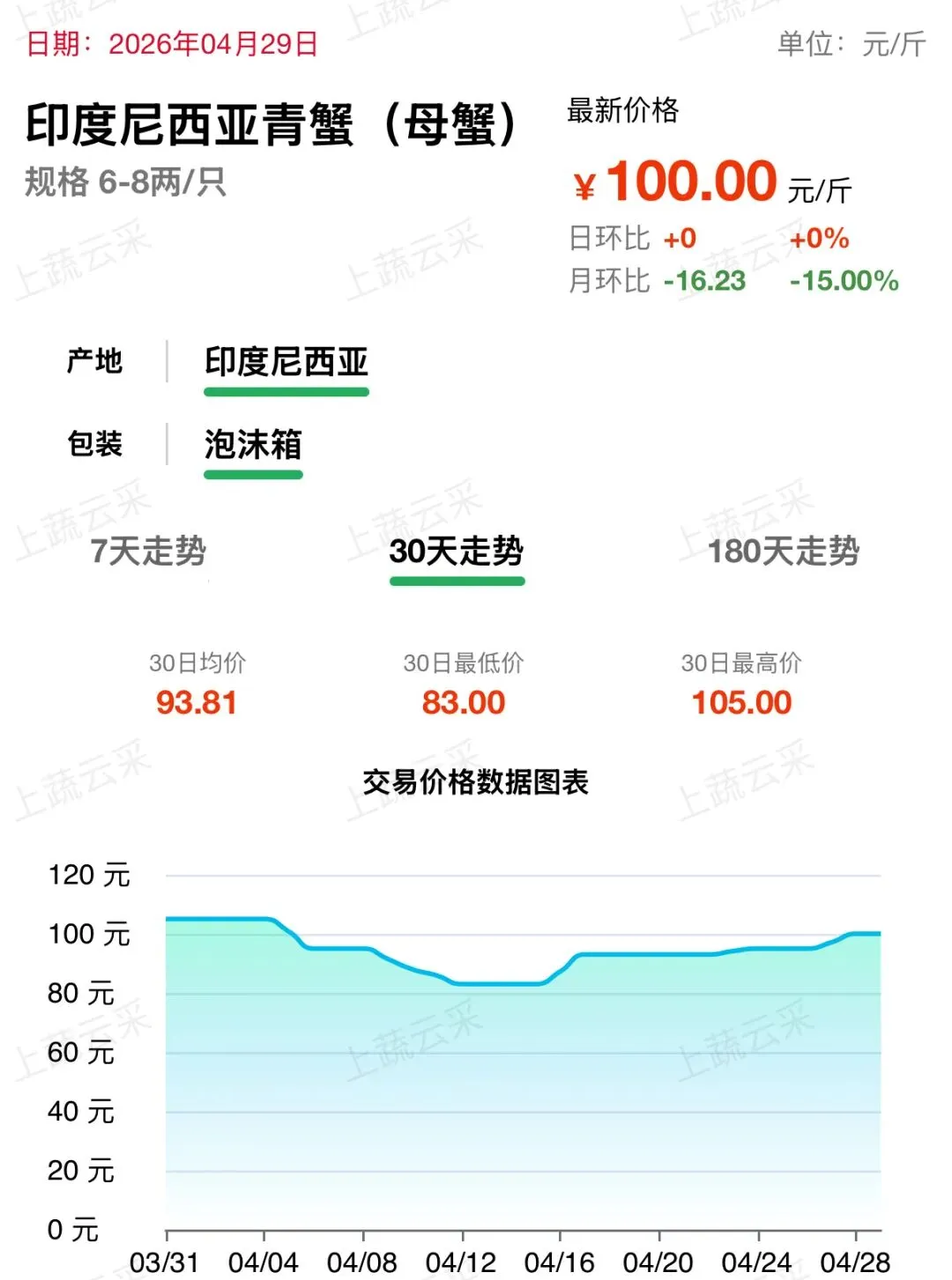 印度尼西亚青蟹主产区印度尼西亚捕捞出口秩序稳定,整体到货货源平稳流通,公蟹供给充足、母蟹优质货源偏少。国内购销节奏平缓,常规补货为主,公蟹行情偏弱、带黄母蟹抗跌性更强。近一周整体窄幅波动,目前公蟹批发价 66 元 / 斤,母蟹批发价 100 元 / 斤。