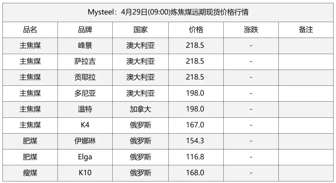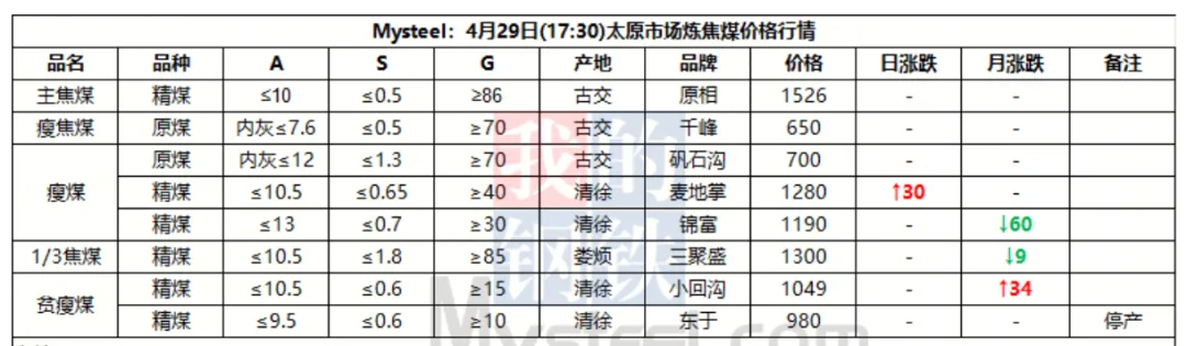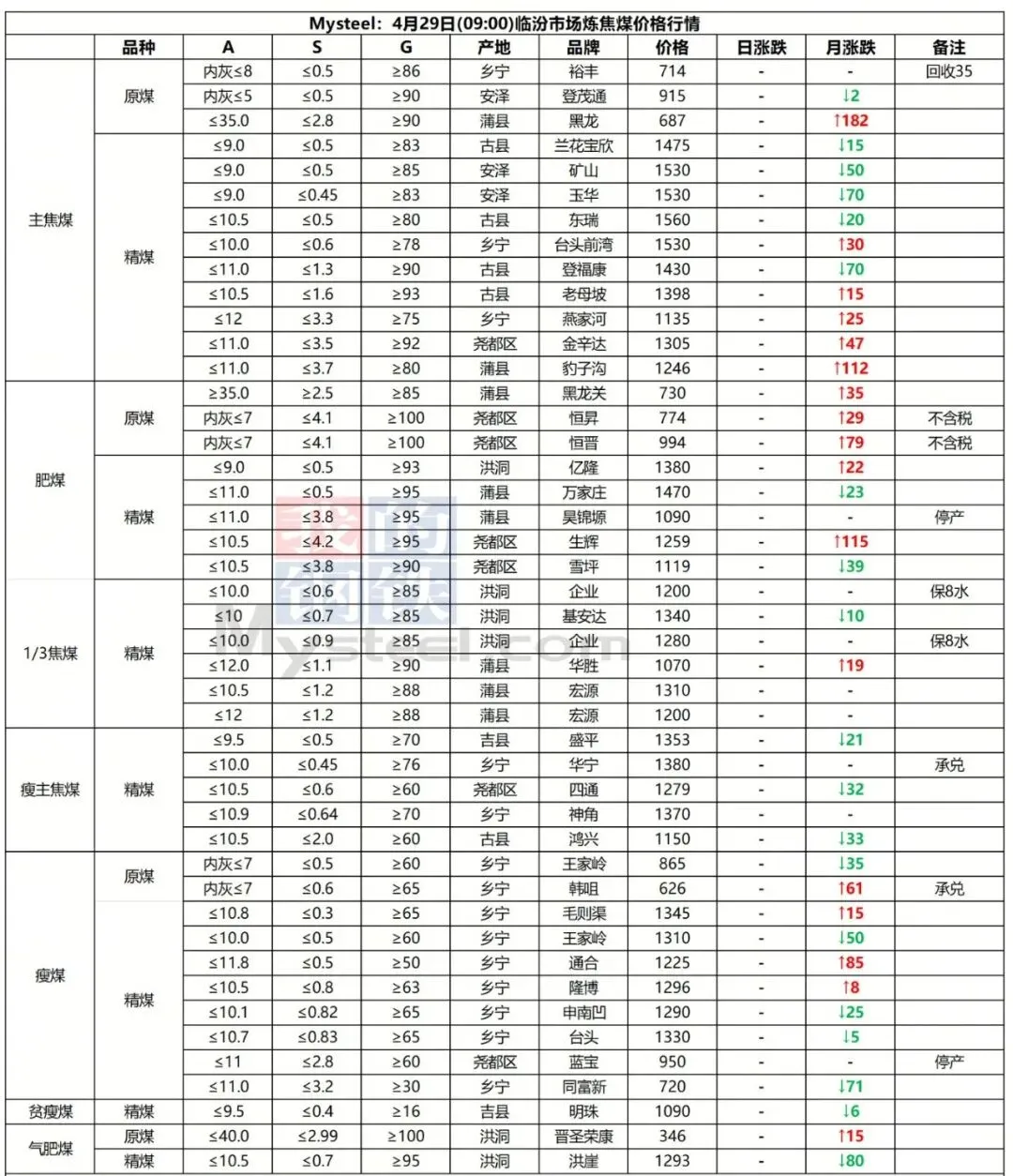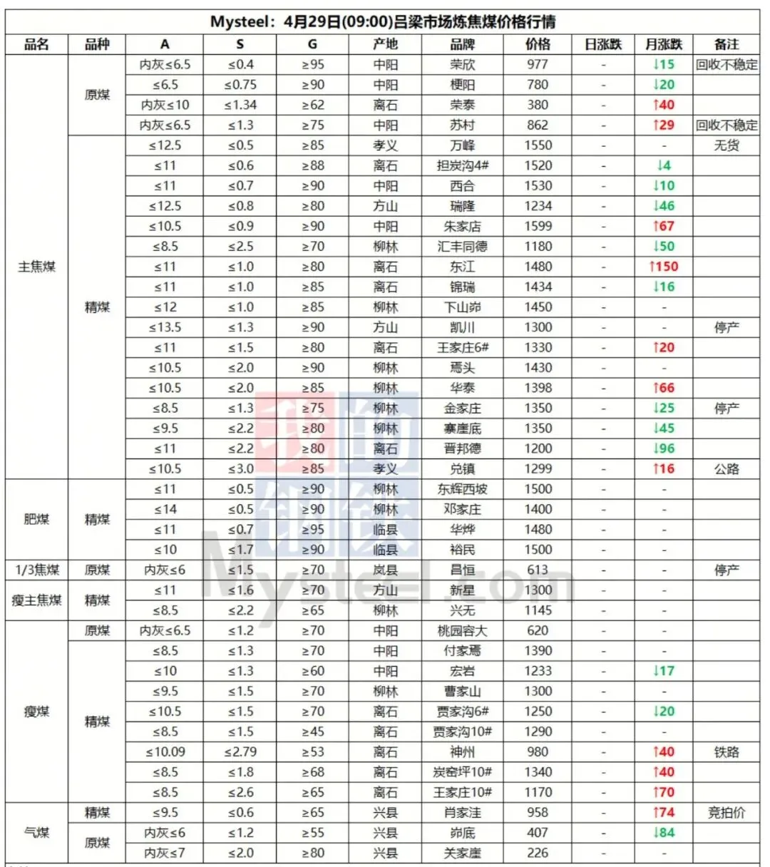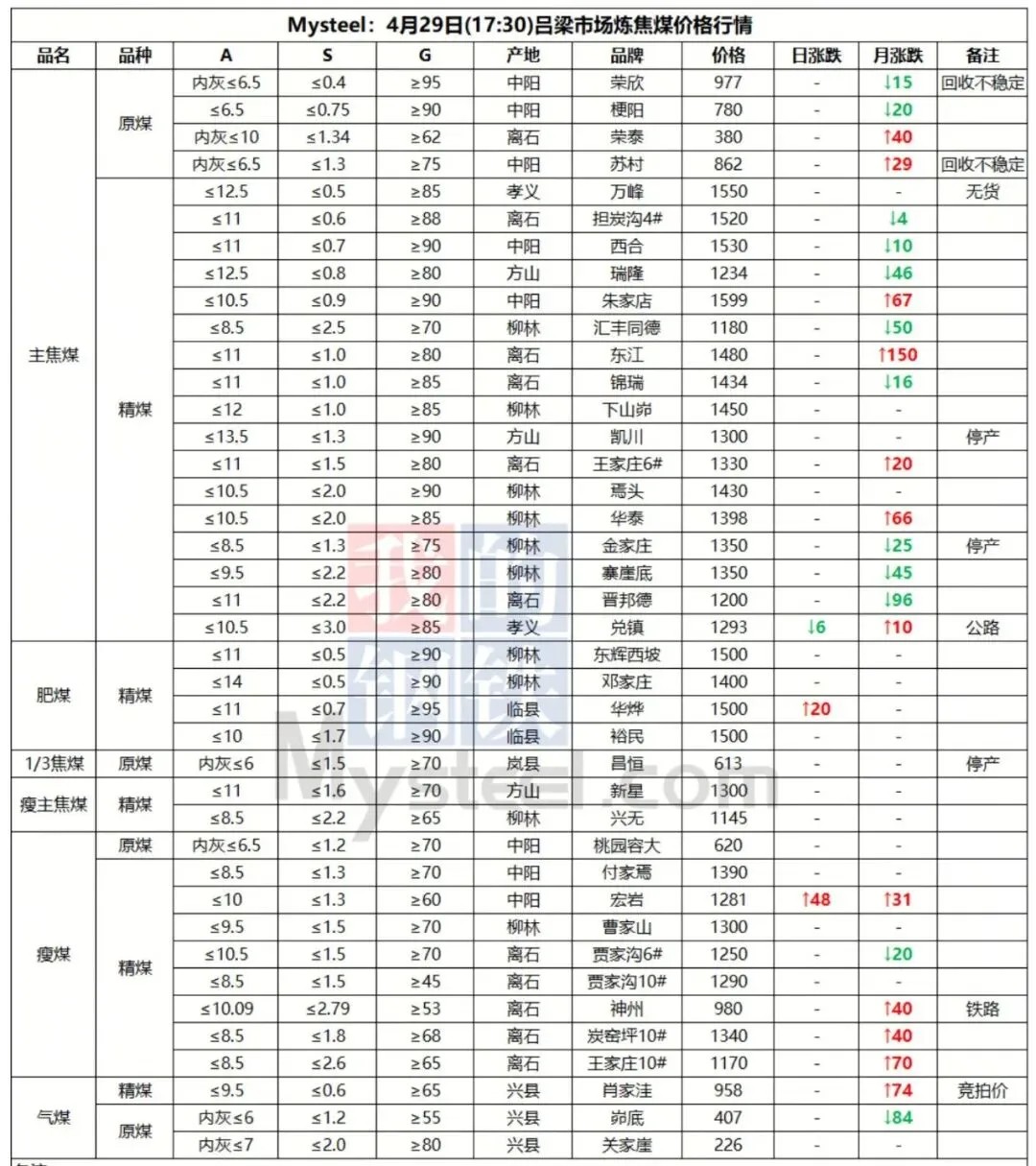 29日吕梁市场炼焦煤震荡运行,线上竞拍成交涨跌互现,市场观望心态浓厚。产地端个别煤矿因月度任务完成停产,多数煤矿正常生产,煤矿新签订单以焦钢终端企业为主,贸易企业采购量较小,煤矿库存处于中低位,线上竞拍成交涨跌互现。中间洗煤及贸易企业采销情绪一般,观望心态浓厚。考虑到五一小长假,下游焦企仍有补库需求,焦炭第三轮提涨后暂未落地。短期内炼焦煤价格窄幅震荡运行,价格上涨难度较大。