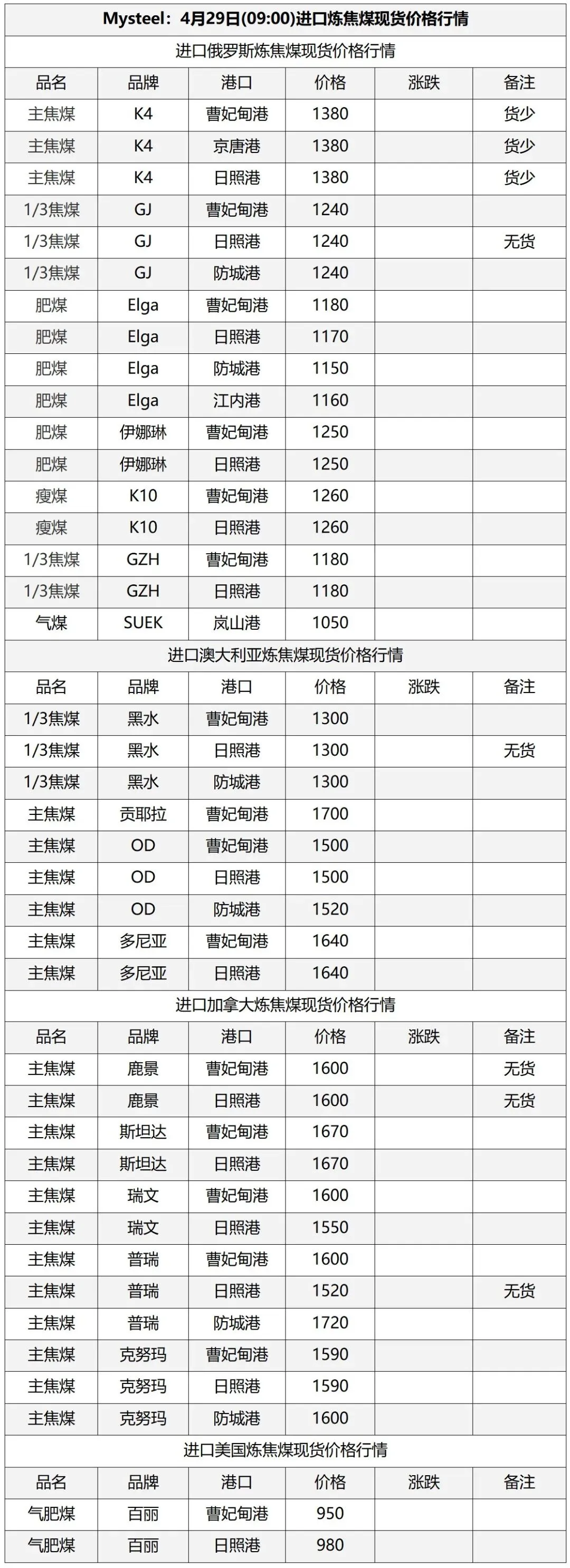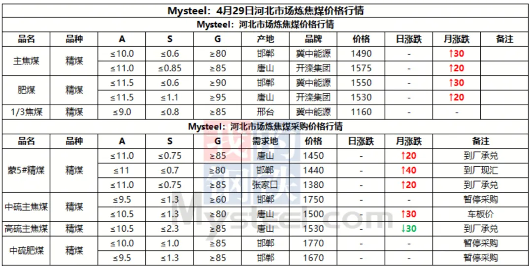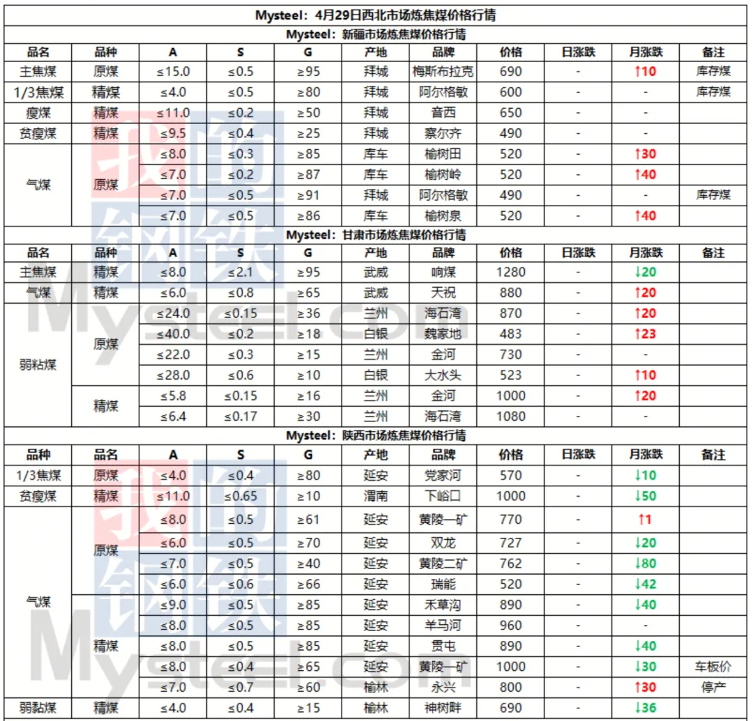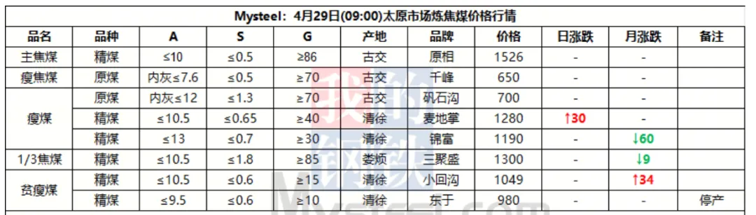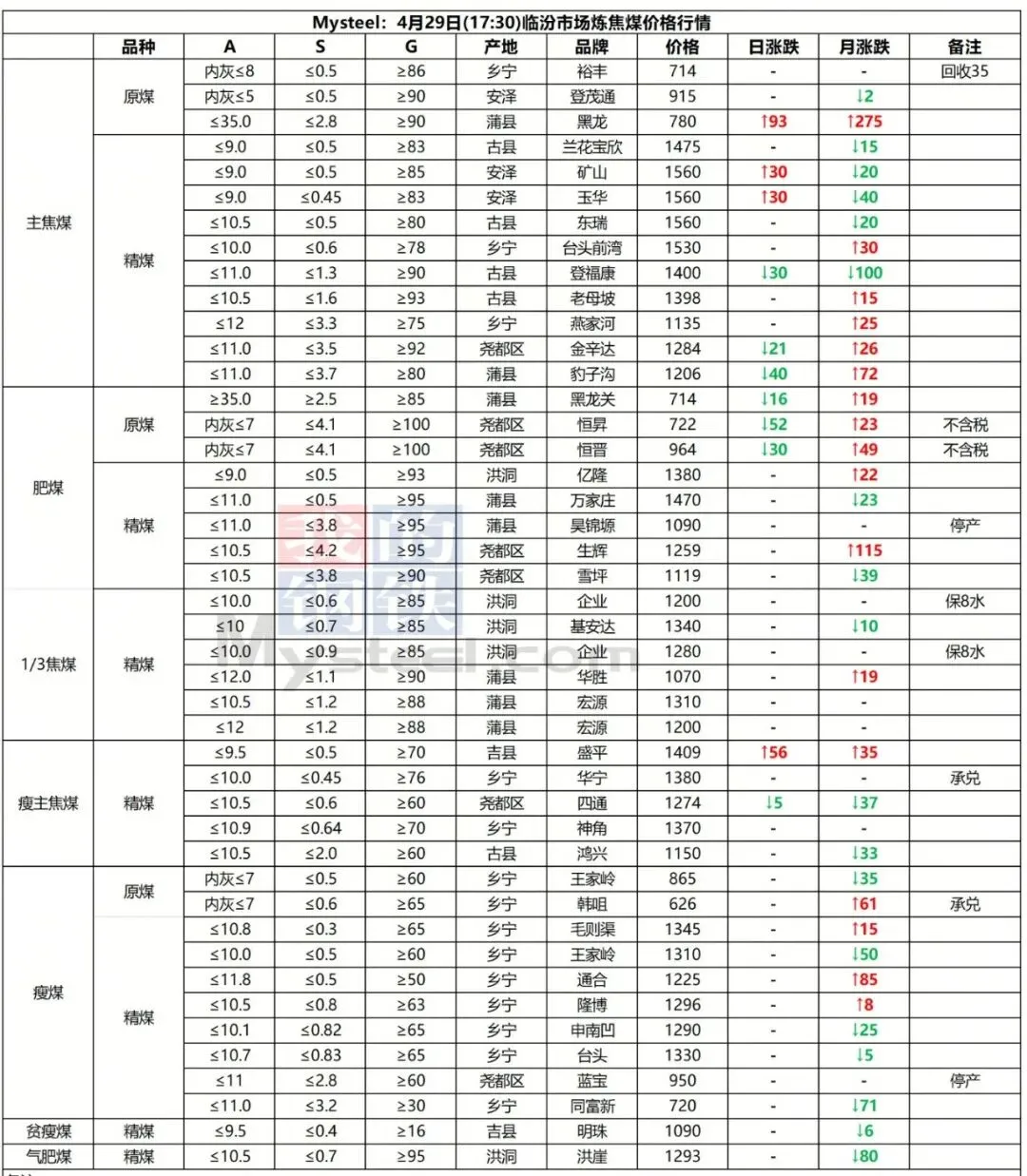 29日吕梁市场炼焦煤震荡运行,线上竞拍成交涨跌互现,市场观望心态浓厚。产地端个别煤矿因月度任务完成停产,多数煤矿正常生产,煤矿新签订单以焦钢终端企业为主,贸易企业采购量较小,煤矿库存处于中低位,线上竞拍成交涨跌互现。中间洗煤及贸易企业采销情绪一般,观望心态浓厚。考虑到五一小长假,下游焦企仍有补库需求,焦炭第三轮提涨后暂未落地。短期内炼焦煤价格窄幅震荡运行,价格上涨难度较大。